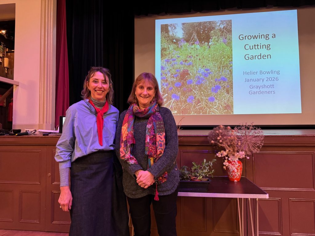 On 14 January, Helier Bowling gave Grayshott Gardeners a very informative talk with many tips on growing a cutting garden. Helier previously practiced as a lawyer for British Gas but found a new life as a garden designer based in Hampshire as well as running online courses which helps people to sow and grow their own flower gardens. She has won medals at Chelsea and Hampton Court. She also has Instagram followers (@garden_goddess_uk). In 2022 she won a 5 Star Award at Hampton Court Flower Show, in 2024 she won the Wooden Garden at The Royal Windsor Show. First place at Hampton Court Flower Show in 2025 and a Silver Medal for her Balcony Garden at Chelsea, where she had the privilege to meet King Charles and discuss her award.