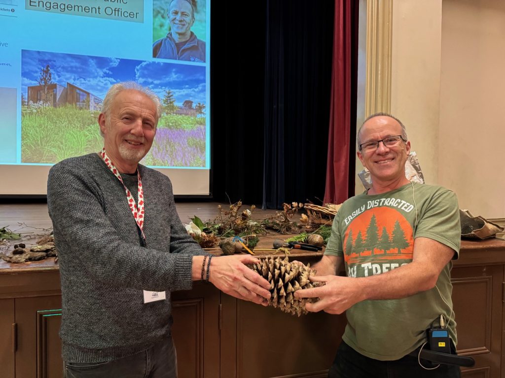 Jonathan told the audience that there are 74,000 known species of trees of which 17,000 are threatened. He described how trees were a benefit, and how they can be a disservice as in allergies, the maintenance of them and falling leaves and making them safe (there are 4 ½ deaths per year by falling trees).